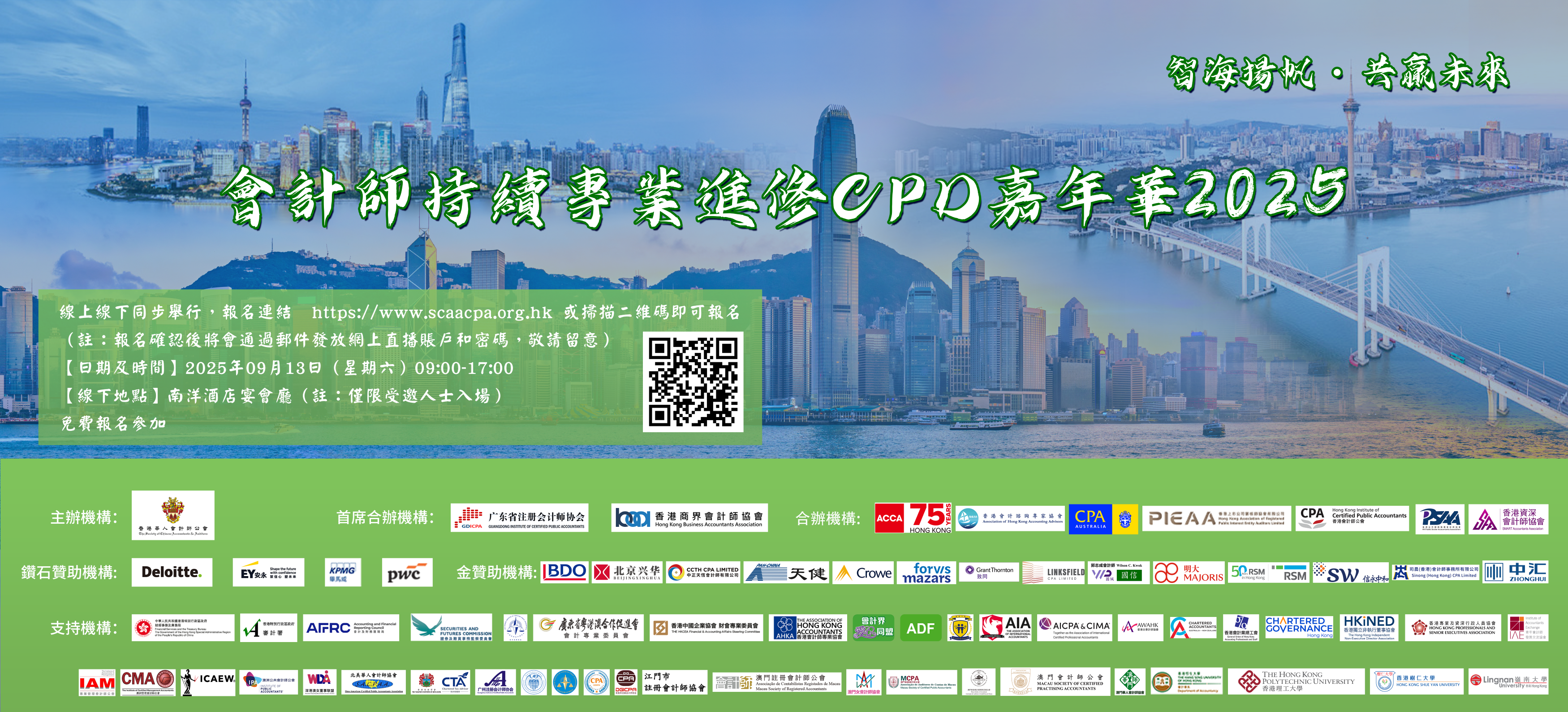 香港商界會計師協會(首席合辦機構)聯同其他會計團體於2025年9月13日聯合舉辦2025年度會計師持續專業進修(CPD)嘉年華,主題為「智海揚帆,共贏未來」。活動詳情如下: