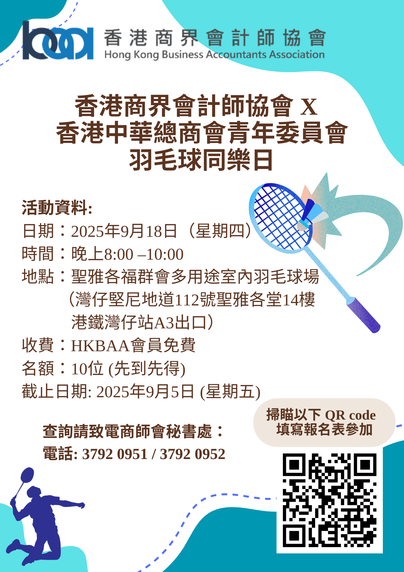 地點: | 聖雅各福群會多用途室內羽毛球場 (灣仔堅尼地道112號聖雅各堂14樓;港鐵灣仔站A3出口 ) |