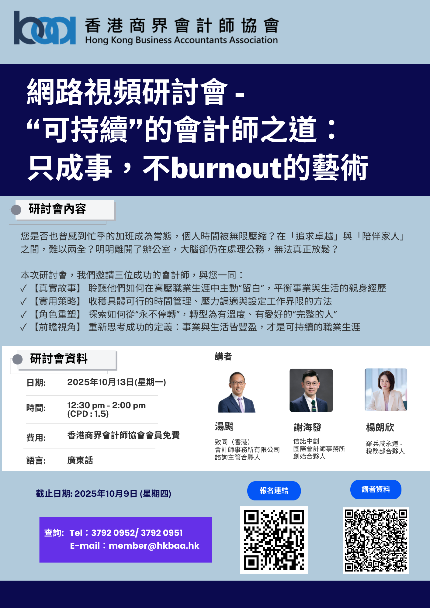 日期: 2025年10月13日 (星期一) 時間: 下午1 2:30 - 2:00 1:00 - 2:30 (CPD Hour: 1.5 hrs) 形式: Zoom 語言: 廣東話 費用: 香港商界會計師協會會員免費 截止日期: 2025年10月9日 Enquiries: