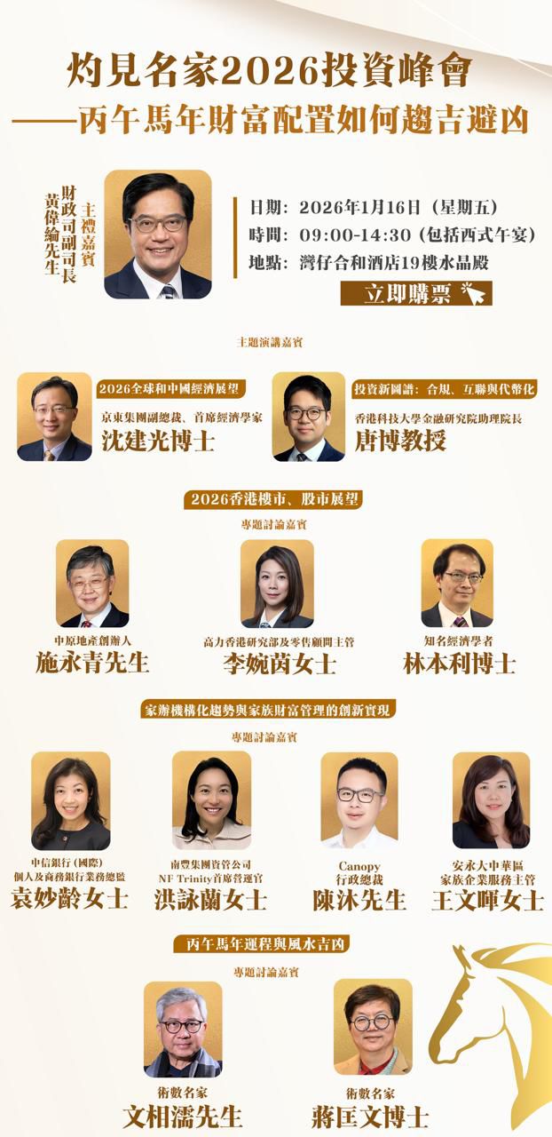 2025年的環球金融市場充滿挑戰與機會,大家對2026年的投資大勢自然充滿期許,為了深入了解市場動向與趨勢,灼見名家傳媒舉辦2026投資峰會,特別邀請多位金融市場專家、學者提供深度分析,幫助大家在新的一年中開創佳績。