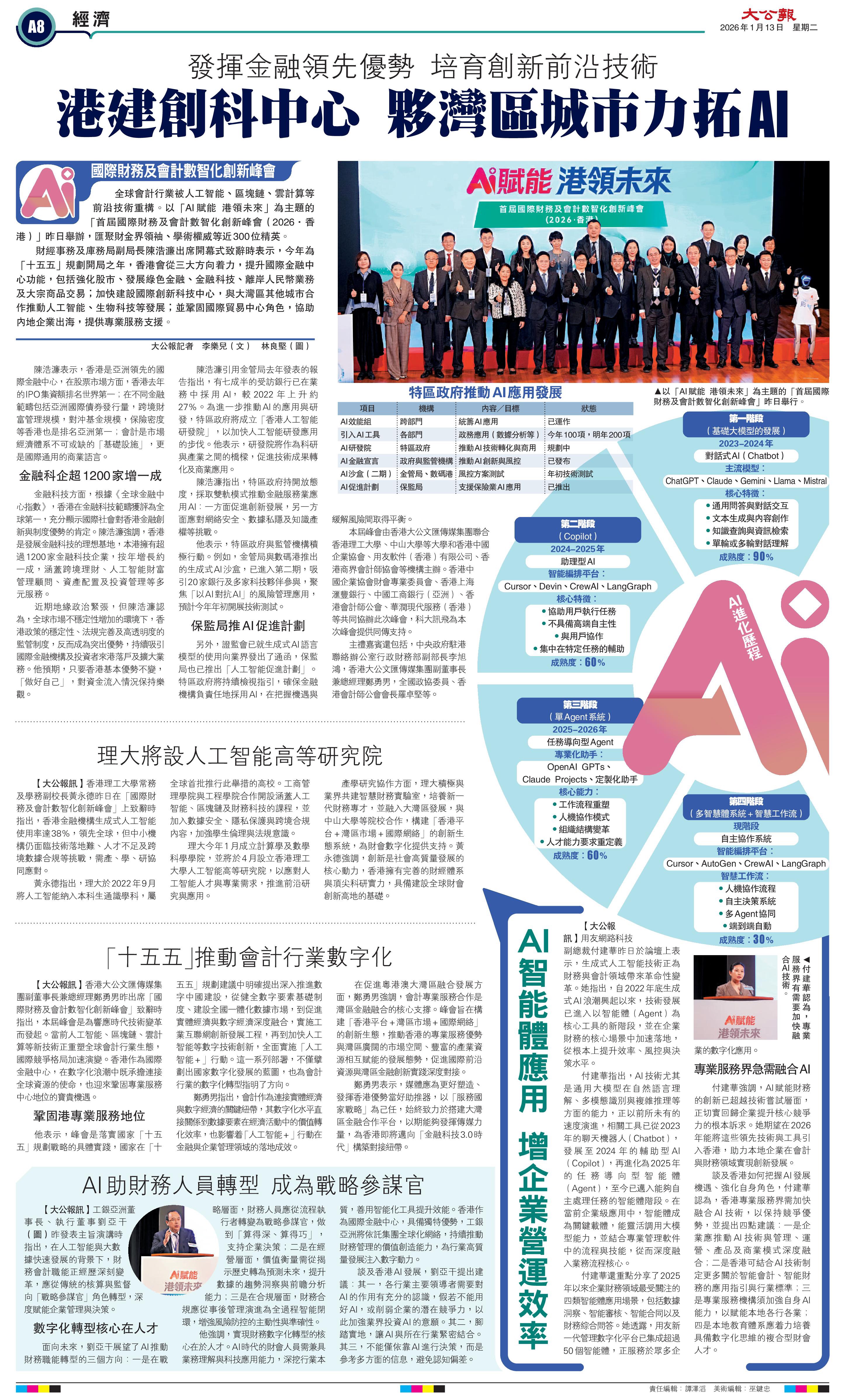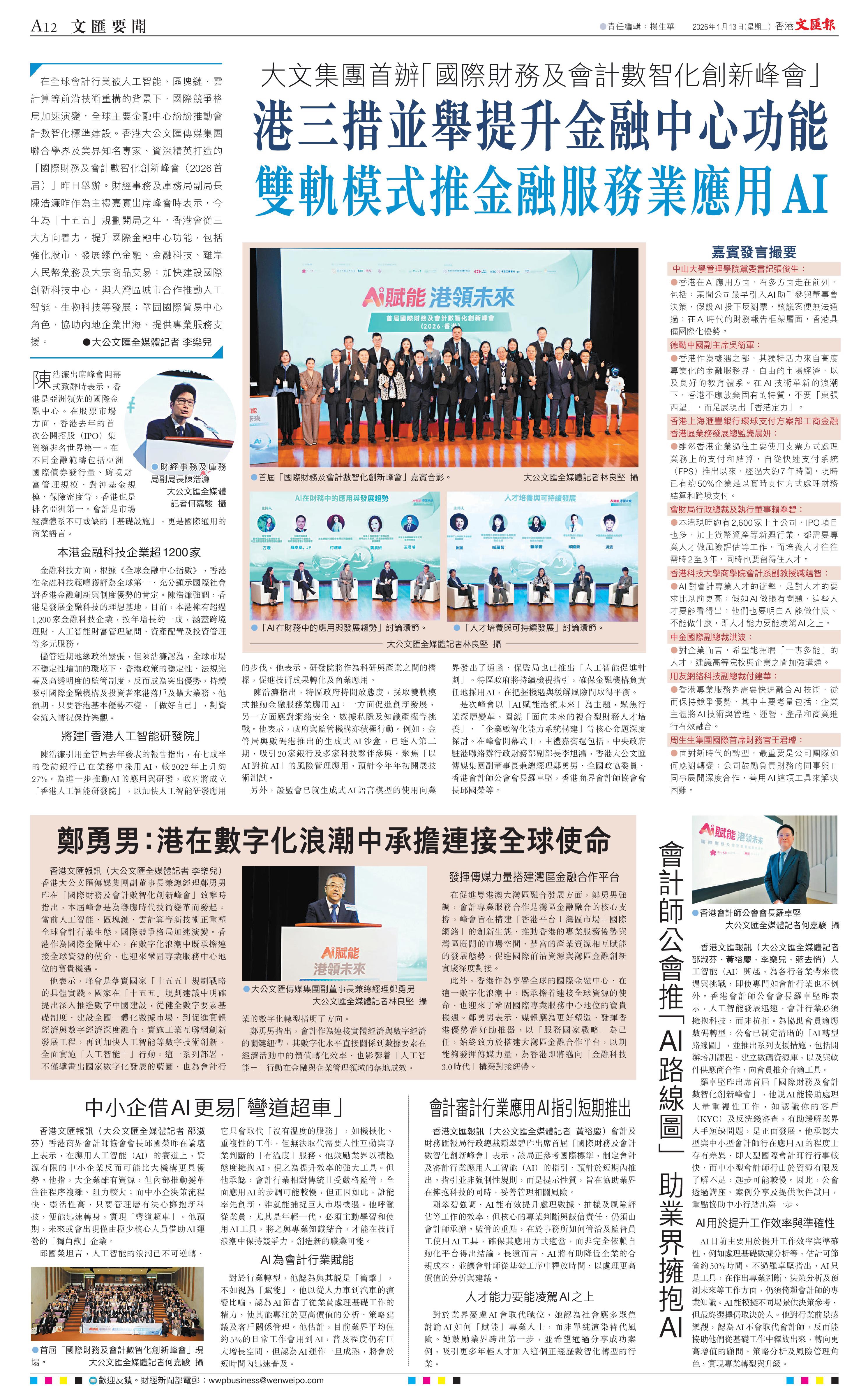 2026年1月12日,香港商界會計師協會聯合香港大公文匯傳媒集團、用友軟體(香港)有限公司、香港理工大學、中山大學及香港中國企業協會等多家權威機構共同主辦的首屆「國際財務及會計數智化創新峰會」在香港成功舉辦。本次峰會以“AI賦能,港領未來”為主題,彙聚了來自政、商、學、專業界別的領導、專家及從業者,共同探討人工智慧技術為財務與會計行業帶來的深刻變革與發展機遇。