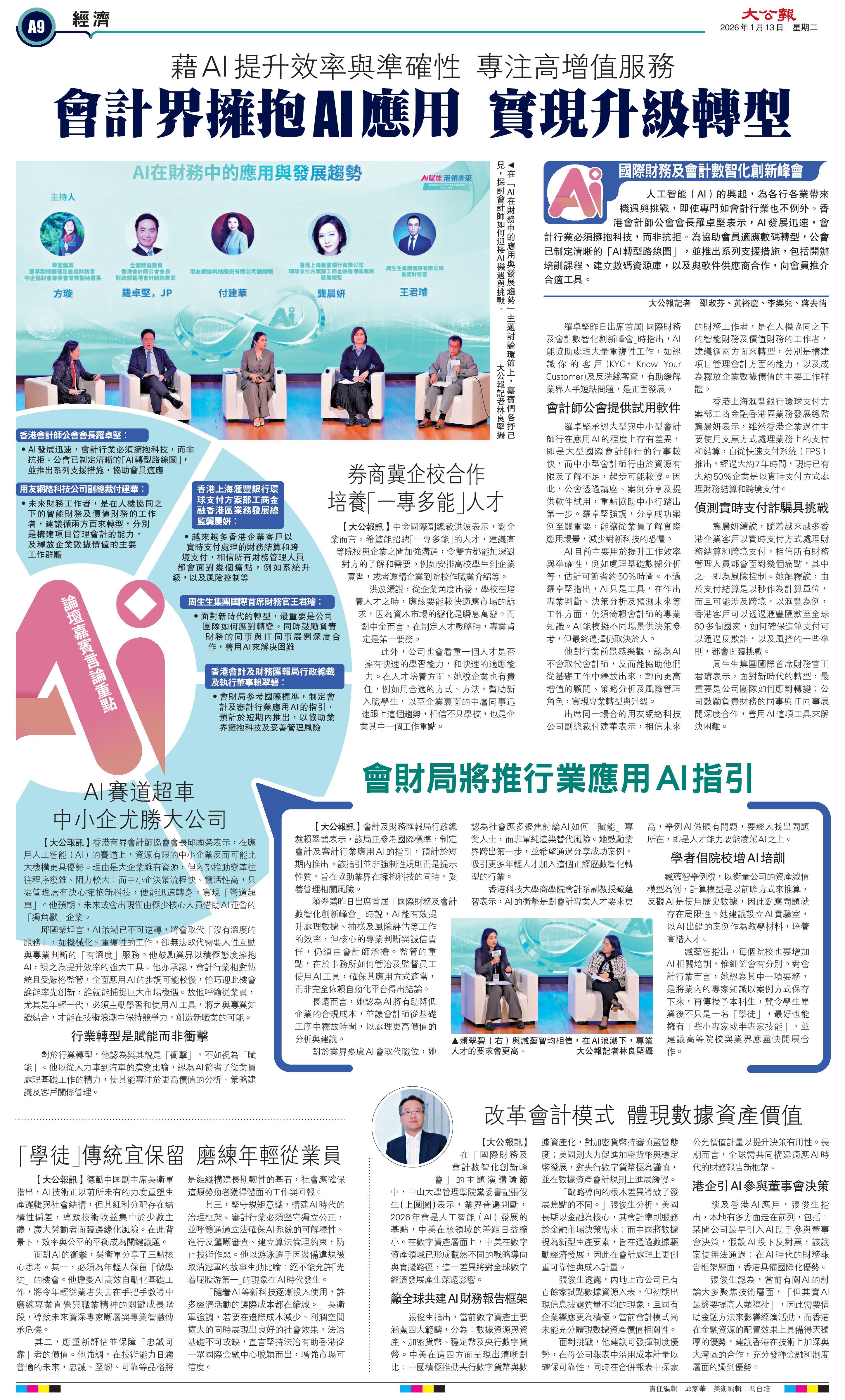 峰會上,香港會計師公會會長羅卓堅同樣指出,AI能有效協助處理如“認識你的客戶”(KYC)及反洗錢審查等重複性工作,緩解業界人手壓力,並強調專業判斷與決策仍須依賴會計師的專識。他的分享進一步印證了“科技為輔,專業為本”的行業共識。