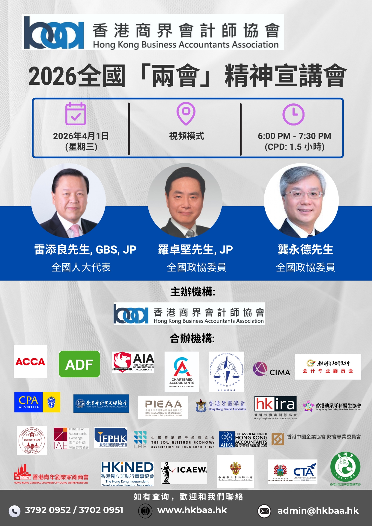 為協助本港商界及專業人士深入了解2026年全國「兩會」的核心精神及其對香港未來發展的啟示,誠邀 閣下參與由我會與多家友會合辦的「2026全國『兩會』精神宣講會」。 是次宣講會特邀三位重量級嘉賓擔任講者,分享他們參會期間的所見所聞,並剖析國家最新政策走向及其對香港經濟與專業領域的影響: - 雷添良先生, GBS, JP(全國人大代表) - 羅卓堅先生, JP(全國政協委員) - 龔永德先生(全國政協委員)